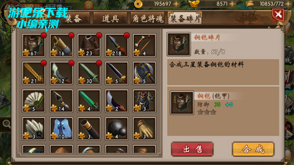 装备碎片界面可以对已经收集到的装备碎片进行“合成”、“出售”操作