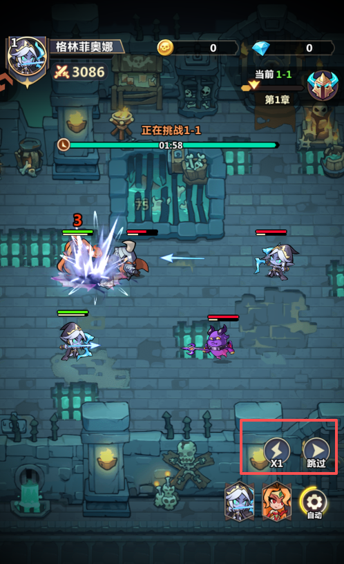3、在游戏的战斗过程中,玩家可以通过滑动屏幕来移动整个队伍位置,可以用于躲避敌人的大招,此外,玩家可以点击屏幕右下角的图标加快战斗过程或者直接跳过战斗。