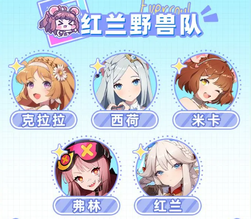 五野兽阵容,上阵就能获得攻击加 25% 和体力加 25% 的增益。红兰是队中的主要输出,她有着超强的范围攻击,还能持续对敌人造成寒气伤害。弗林是队中副 C,并且她的大招有着较强的群控能力。西荷和克拉拉的双加血搭配能为队伍的生存带来保障,且西荷还可沉默敌人,克拉拉可眩晕敌人,也能为全体提供防御力加成,米卡则作为队内唯一的战士顶着前方。