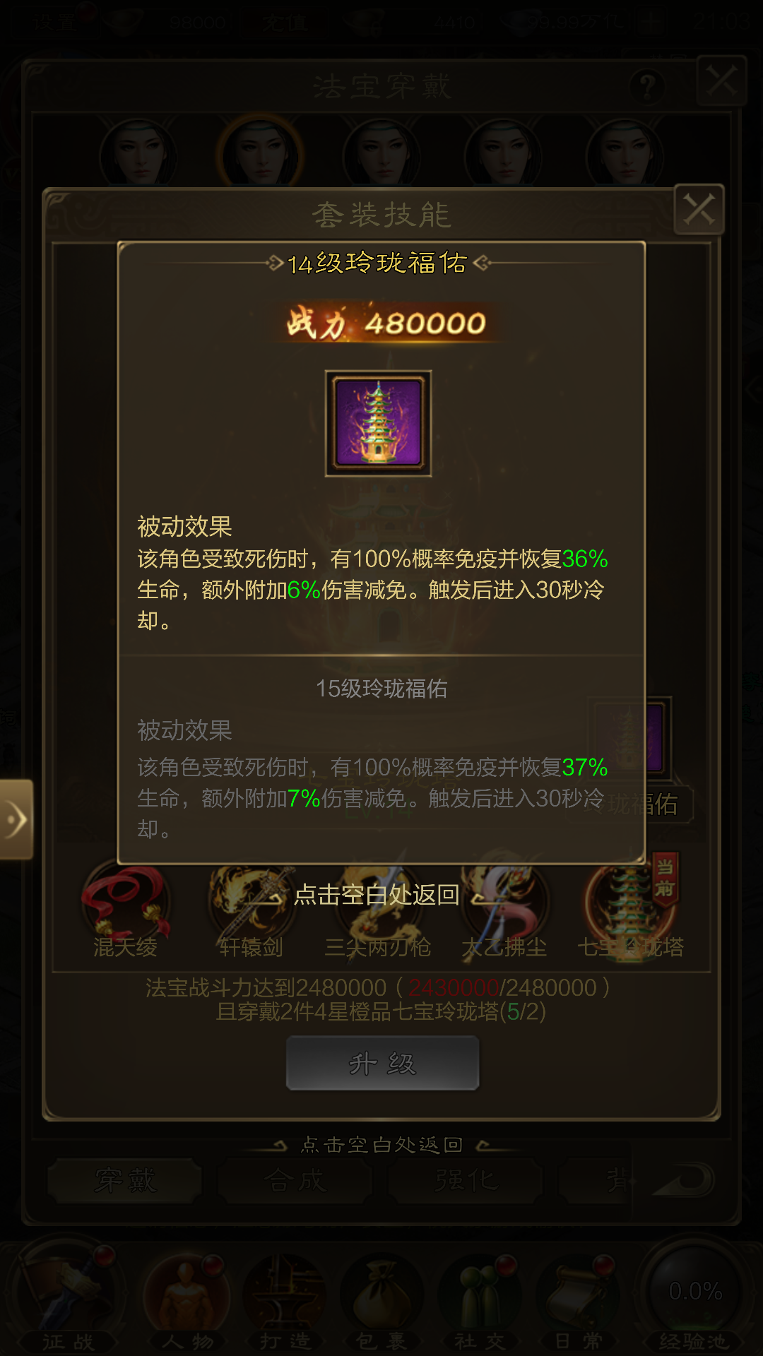 (4)七宝玲珑塔:受到致死伤害,必定免疫死亡并回复生命值,且额外增加一段时间的伤害减免效果