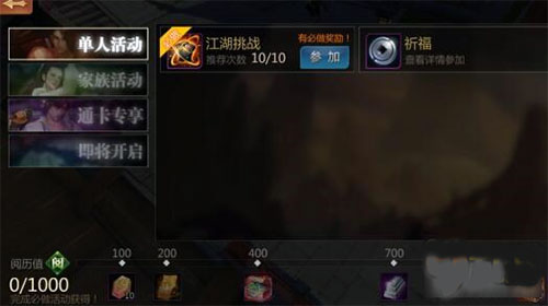 点击【活动】,进入每日必做活动页面,完成每日必做活动。可通过此页面下方的阅历值进度条,看到当日阅历值的获取情况。