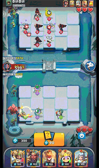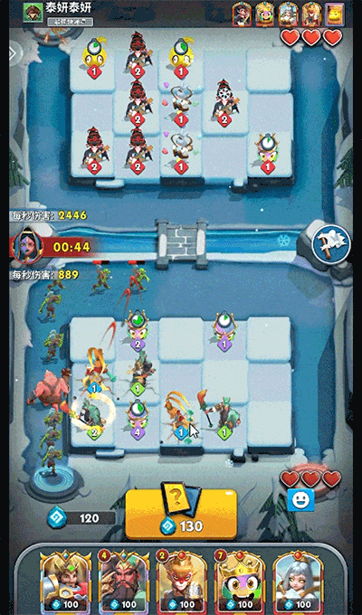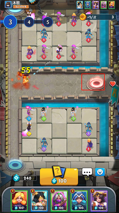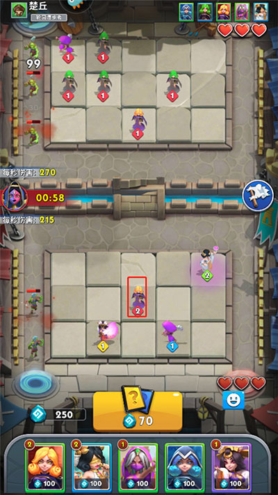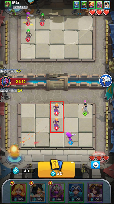 2、进入后双方各自占据一片场地,双方各自拥有三点生命值,敌人每突破一次防线生命值便会减少一点,生命值归零则游戏结束,玩家需要通过花费宝石来放置英雄,让英雄攻击魔物;