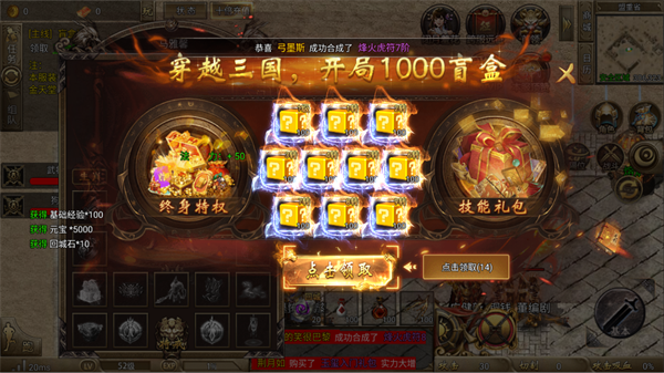 进入游戏后,优先领取“穿越三国,开局1000盲盒”活动奖励。开启盲盒可以快速获得装备、元宝等资源,为前期养成奠定坚实基础。