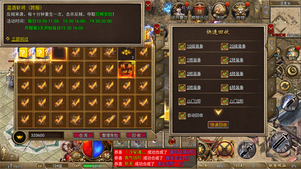开启自动回收功能,及时回收低等级和闲置装备,获取传奇币与经验,并腾出背包空间,为拾取更高价值装备做好准备。
