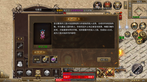 优先完成主线任务,尤其是“加入三国”任务,获得大量经验、元宝和回城石,帮助快速提升等级并解锁更多核心玩法。