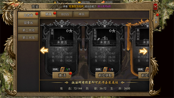 通过收集对应道具激活图鉴,可直接提升攻击、防御和生命属性。集齐整套图鉴还能解锁额外套装属性。前期建议优先激活“流寇”等低门槛图鉴,迅速提升基础战力,为后续BOSS挑战和PK做好准备。