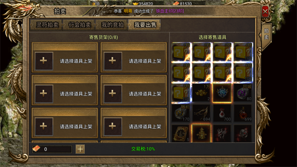 拍卖系统允许玩家将多余装备或道具上架寄售,交易税仅为10%。新手可以将掉落的非绑定道具出售,换取灵符或元宝,再用于购买所需装备或材料,实现资源循环利用。