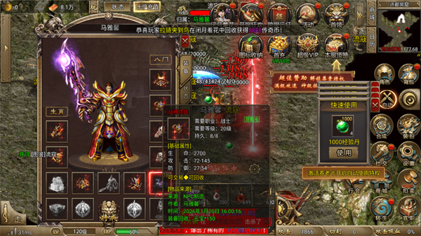新手角色可享受自动回收、全屏拾取和离线助手福利,挂机刷怪也能轻松爆装。多余装备可回收或合成更高阶武器,同时通过狩猎场、矿场等玩法获取灵符和传奇币,让养成节奏轻松且稳定。