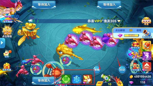5、在游戏内可以开启自动模式还没换炮,加大倍数更有多种道具帮助你更好的捕捉到大鱼。