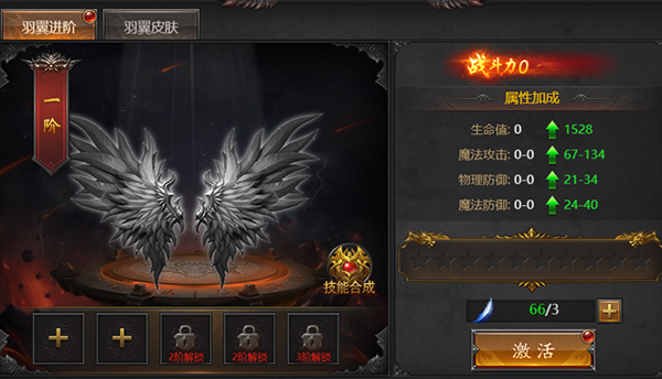 3、羽翼皮肤,可收集皮肤碎片,激活对应的羽翼皮肤,激活成功后获得相应的属性加成。如获得相同碎片,可升级同部位碎片属性。