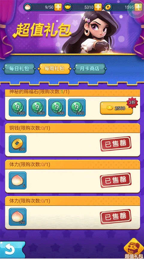 提升等级可以解锁更多功能,建议购买每周的桃子礼包,300元宝获得260体力,性价比极高,其他不建议购买。