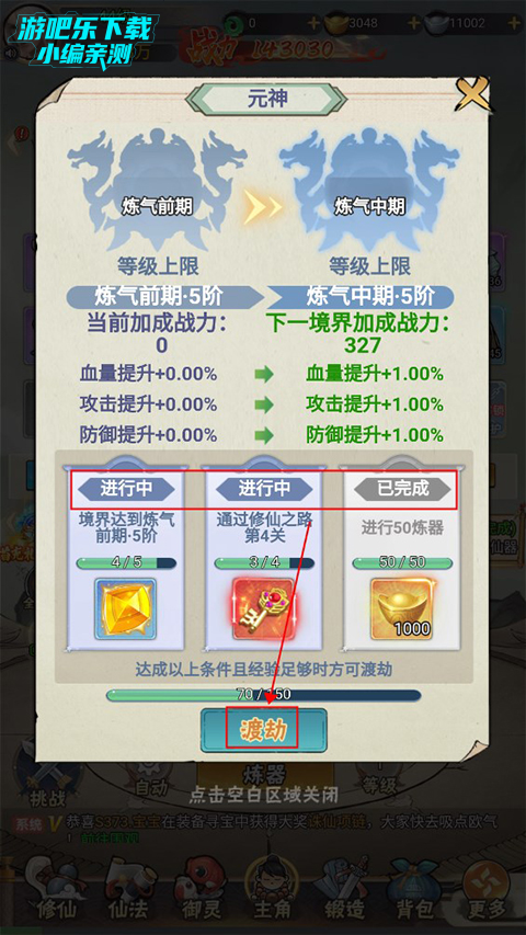 6、玩家通过炼器、关卡、升级等可以完成元神任务。全部完成后即可进行渡劫提升,提高修炼等级。