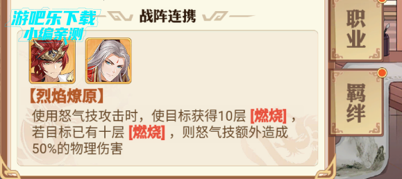 再来看下太史慈的战阵连携,与周瑜同时上阵,使用怒气技攻击时,可以使目标获得10层燃烧,十层燃烧的概念就是行动结束的时候,可以直接让目标损失30%攻击的生命值。如果目标已经有十层燃烧,那么怒气技会额外造成50的物理伤害。这也就可以看出为什么说太史慈是燃烧队的核心,并且为什么燃烧队热度这么高。