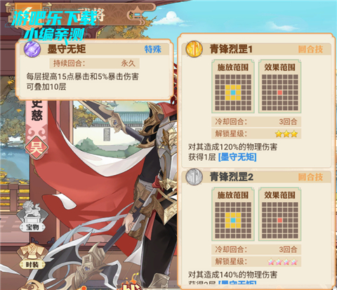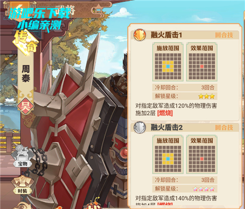 看到周泰拿个盾想必大家也知道他属于肉盾了,周泰的作用主要放在前面挨揍,为什么这么说呢,首先周泰在释放怒气技的时候可以增加自身物攻抗性,受到攻击时,可以给对方施加燃烧,且怒气技的效果范围极大,对于在效果范围内的敌军不仅可以施加燃烧,并且已经有燃烧的敌军还会受到物攻强度的负面效果下降。