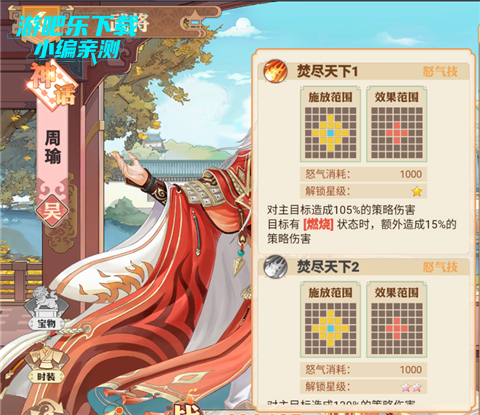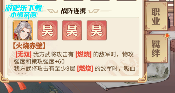 周瑜的战阵连携可以搭配任意吴国将,作为燃烧队唯一有无双技的将,随着燃烧层数的叠加,伤害会越来越高。并且在目标拥有三层燃烧的时候还能吸血。这个将在面对群怪时效果显著,但是遇到单体将还是差了点意思。