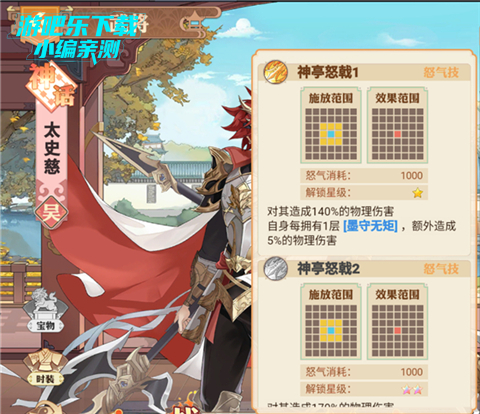 太史慈技能属于单体攻击,主要对单个目标造成伤害,从回合技以及怒气技的技能说明可以看出太史慈的物攻伤害极高,并且可以通过升星叠暴击和暴击伤害。