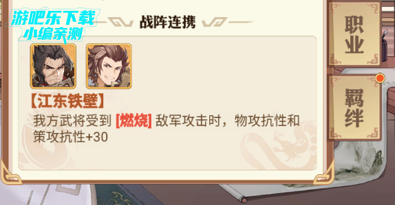 周泰的战阵连携需要与孙策同时上阵触发,我方将受到已经有燃烧的敌军攻击时,可以提升物攻抗性和策攻抗性。