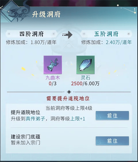 注意:升级洞府需要的九曲木需要通过加入宗门,用宗门贡献去兑换,另一个也要提升自身的道院地位来提升洞府上限,提升道院地位需要累积威望,其中威望值我们可以通过做道院悬赏任务和试炼任务来获得。