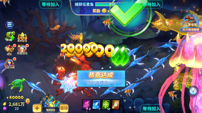 BOSS 级鱼类:1000-200000 倍奖励,如鲸鱼、鲨鱼王等,血量厚,需多人协作捕获,掉落稀有道具