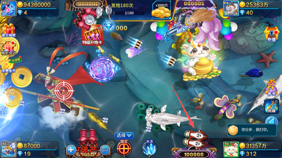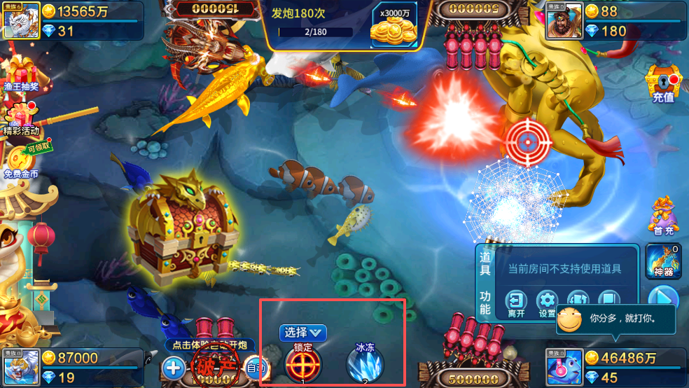 在炮台倍率低时,优先攻击密集小鱼群,利用散射特性批量捕获。