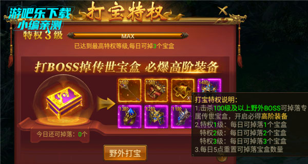 激活打包特权后,在野外BOSS地图挂机,可掉落宝盒,随机开启获得装备or碎片。