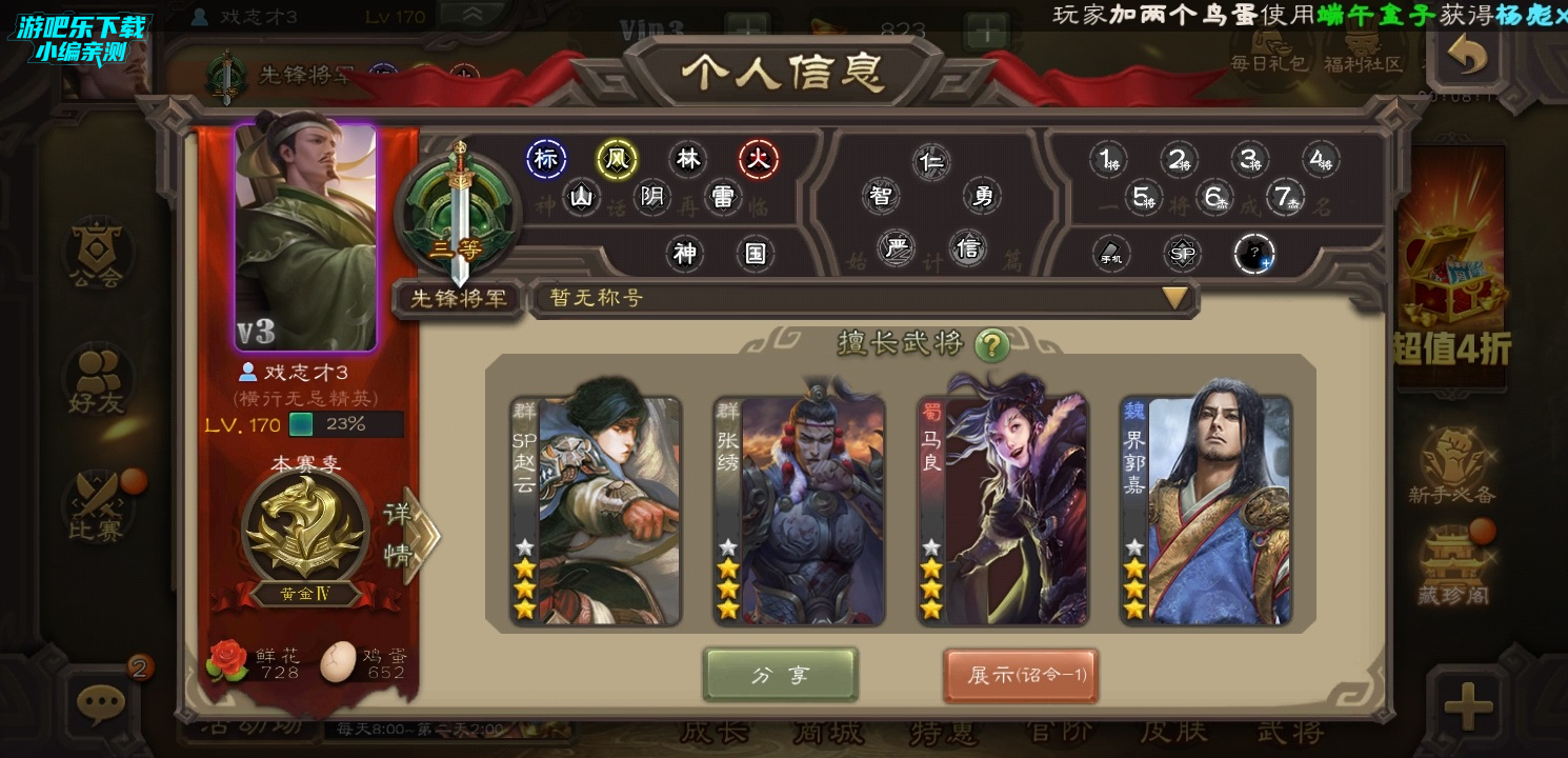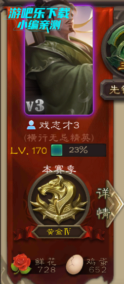 个人主页能够观察到的信息是很多的,常用武将、官阶、最高段位、游戏等级、游戏场次等等。