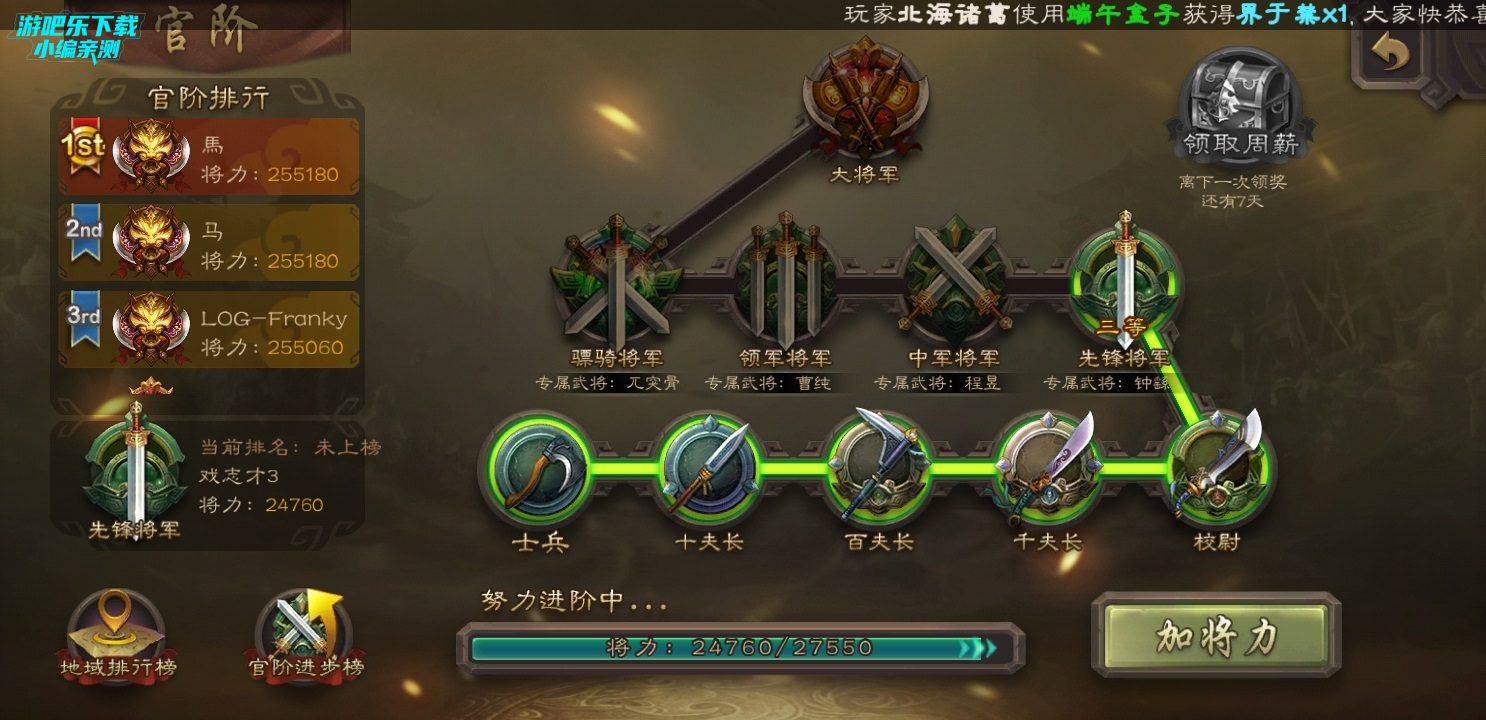 官阶:官阶是官方设定的一个用将力堆积起来的一整个系统,将力足够的时候就可以升级官阶,升级到不同的官阶后都会有相应的奖励。