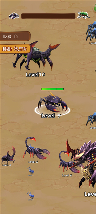 1、沉浸式沙漠生存体验,玩家从弱小蚂蚁起步,在广袤沙漠中迷失,需通过吞噬同类或低级昆虫不断进化体积与能力,最终蜕变为无敌存在,策略性极强。