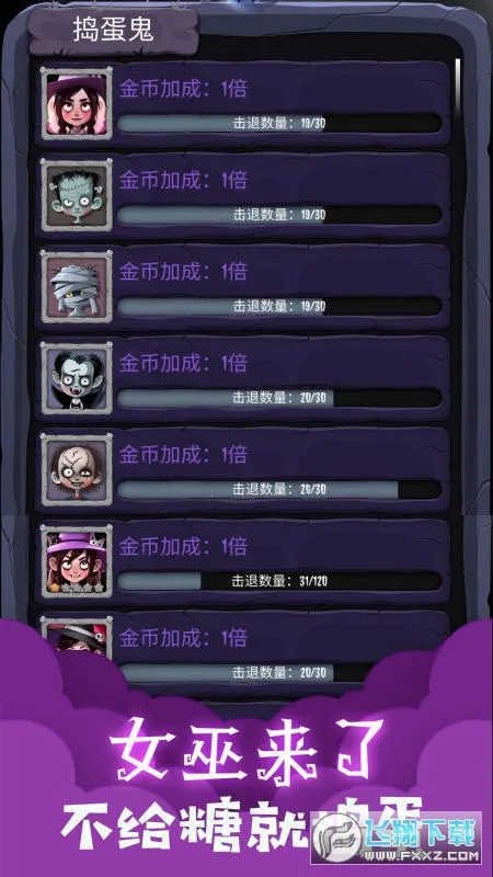 击退捣蛋鬼,获得金币奖励。消耗金币购买黑魔法和配方,提升糖果攻击力,击退更多的捣蛋鬼!