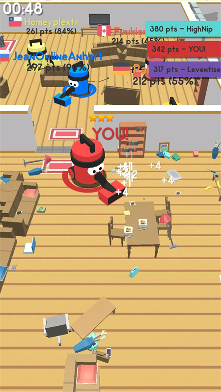 每个不同的吸尘器,都代表着一名玩家,玩家与玩家之间的相遇,也是一场难以避免的斗争,吸尘器之间也是可以互相吞噬的,将比自己体积小的吸尘器吸入体内,你在结束对方生命的同时,自己也会得到迅速的成长,吸入对手比吸入其他物品的成长速度要更快,因此也加速了玩家之间的竞争。