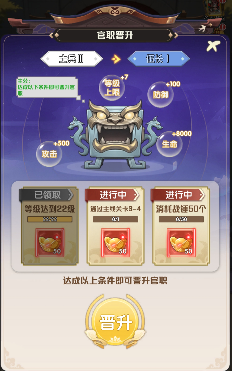官职晋升:完成主线 / 等级 / 战锤任务,解锁等级上限与全属性加成。