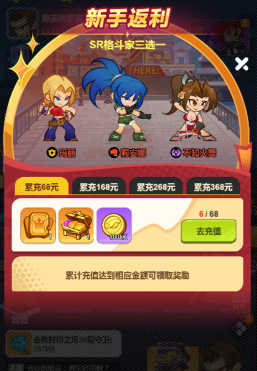 6、格斗家每日礼包 60级之后就有的,30元每天买一个自选英雄礼包,这个礼包只能从一部分里面选一个,每天随机的,如果有自己阵容内的核心角色,那闭着眼买,7、周活动礼包