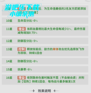貂蝉:控制减益,降低敌方怒气与攻击力,16 星后可与吕布联动增强进攻。
