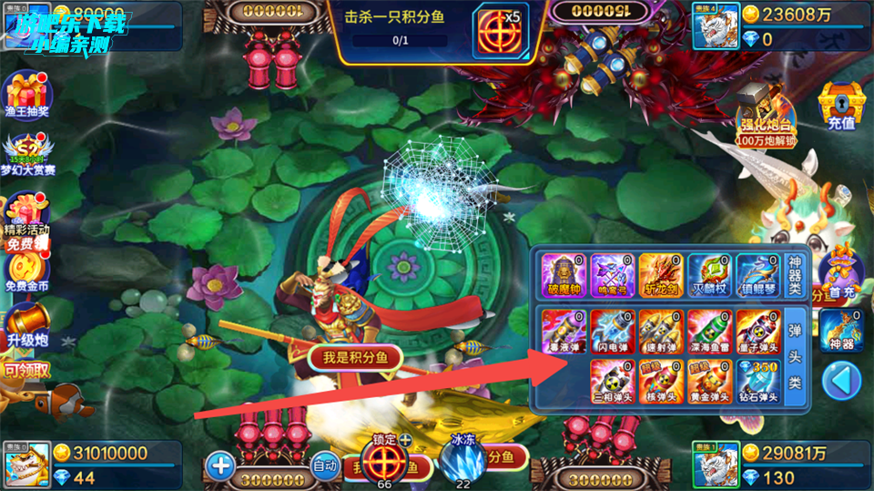 不同炮灵带有不同技能,如申公豹可捕积分鱼充能,攻击全场鱼。