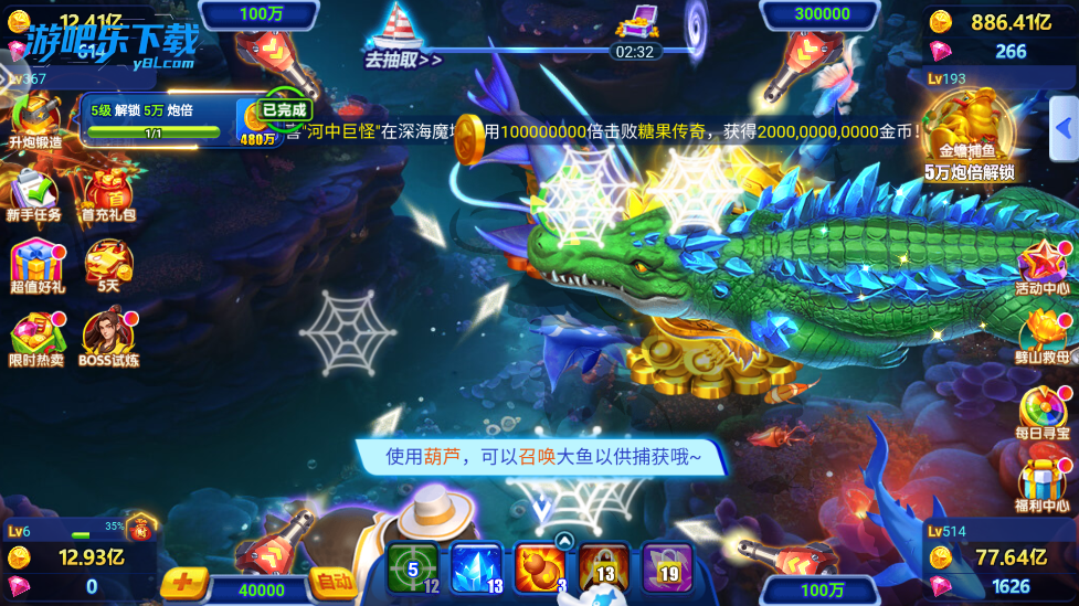4、龙宫仙会:捕获龙太子得龙鳞,即可开启龙舟!满屏爆鱼得万金!还有可爱“金童”、“玉女”等您来捕获哦。