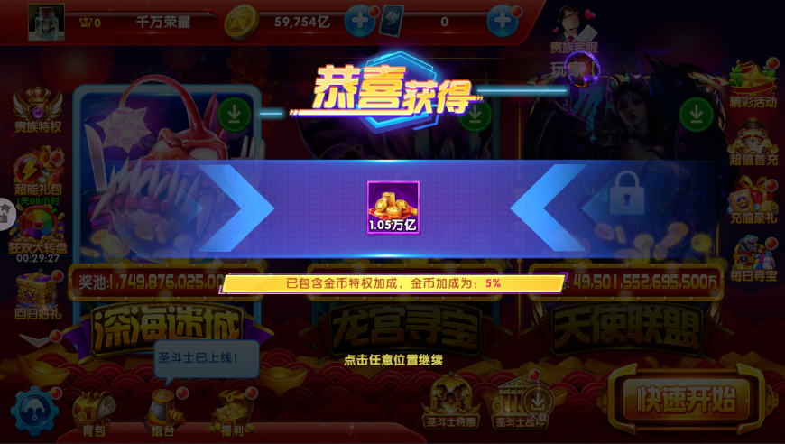 经典渔场:新手 / 进阶 / 高级 / 万倍房,倍率越高奖励越高