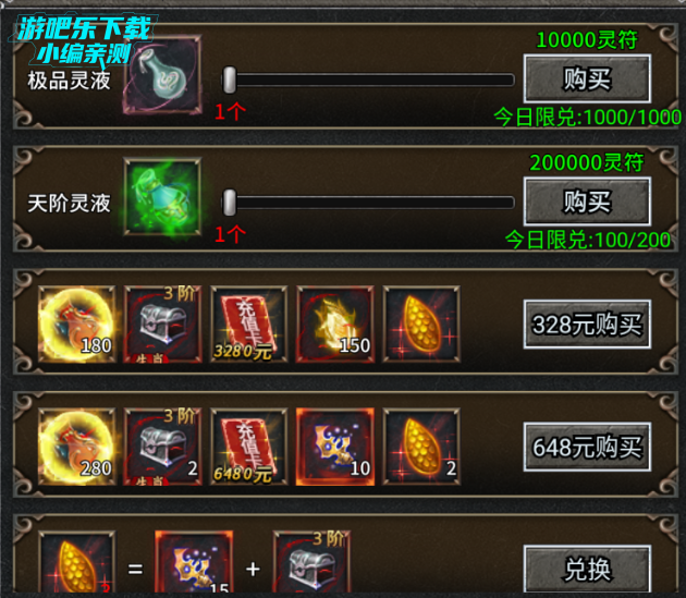 1、十五大陆全新开启孵化灵宠玩法。通过消耗灵液,玩家可获得丰厚奖励。灵液可通过消耗灵符或充值的方式购买。其中,极品灵液每日限兑1000个,天阶每日限兑200个。