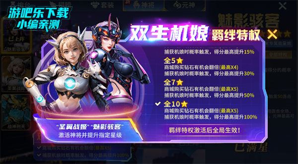 羁绊特权:当大大们同时拥有圣翼战姬、魅影骇客时,捕获机娘时概率触发,得分最高提升15%,如果两个神将全部满5星,商城购买钻石有机会翻倍(最高X4),捕获机娘时概率触发,得分最高提升30%;如果2个神将全部满7星,商城购买钻石有机会翻倍(最高X5),捕获机娘时概率触发,得分最高提升50%;如果2个神将全部满10星,商城购买钻石有机会翻倍(X5),捕获机娘时概率触发,得分最高提升100%