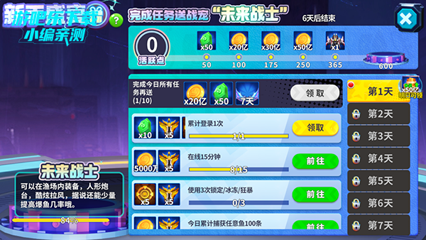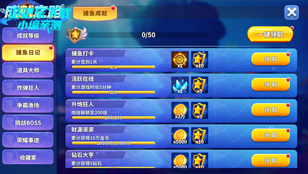 日常 / 成就任务:完成捕鱼、在线、活动任务,部分奖励含点券。