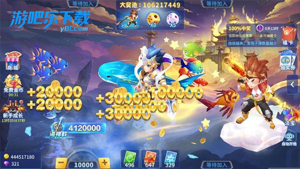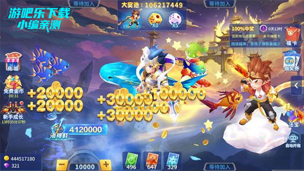 大厅福利转盘、捕鱼专属许愿池,每天免费次数全部用完,随机出大额豆子、高级弹头。