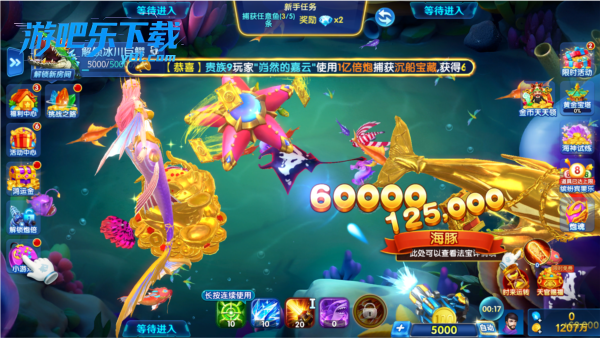 游戏中经常会出现爆炸鱼、特殊戟等特殊鱼种,每种特殊鱼被捕获时均会拥有不同的特效以及特殊功能。比如,爆炸鱼击杀后会有爆炸特效,可100%击杀一定范围内的鱼群,获得丰厚奖励,金币哗啦啦的进入您的口袋。而特殊戟击杀后,虽然没有金币奖励,但是您会获得一个特殊的炮台,并且在80秒内可以免费发射,您可以在密集鱼群到来之后,先捕获一个特殊戟,然后就盯着鱼群猛然发起特殊戟攻击,助您一举拿下鱼群。不过,这些鱼种都是比较难捕获一点的,如果不看自己金币数量和鱼类的位置而乱打一气,这样肯定是比较容易消耗金币的。