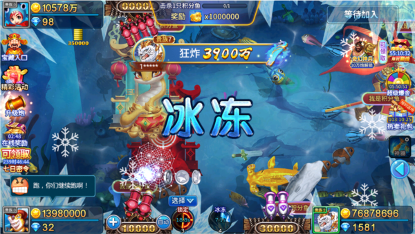 经过实战测试,冰冻技能使用后,可以将鱼类冻住的时间大约是十秒钟,也就是鱼类十秒钟无法游动,是处于静止不动的状态,我们则可以使用炮弹打击静止的鱼类十秒。