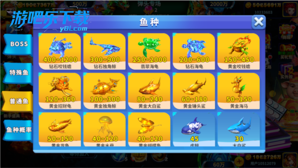 鱼类丰富:200 + 种,含普通小鱼(1–10 倍)、中等鱼(20–100 倍)、黄金鱼(150–500 倍)、BOSS(500–1000 倍,如黄金鲨鱼、深海巨鲸)。