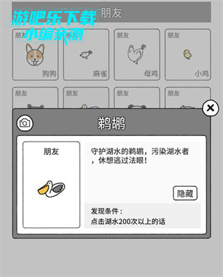 村子前面那个湖,你不停的点会发现还有鱼跳出水面,当你点击超过200次之后就会召唤鹈鹕啦~