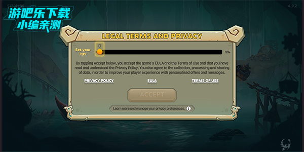 2、成功进入游戏后会来到选择年龄的界面,滑动上方的可拖动条至18以上,然后点击下方的ACCEPT按钮即可进入游戏。