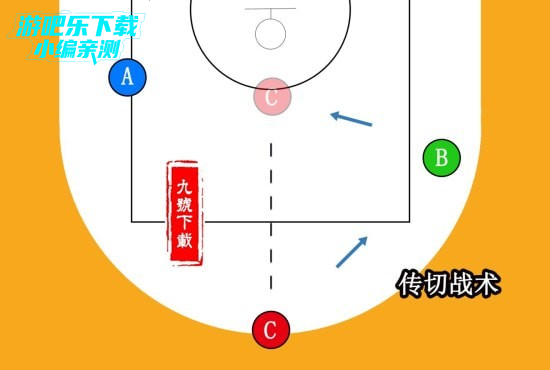 传切战术两名球员配合,外线球员最好配置一名PG组织后卫(控球分球的手感好)。传切战术在球场中很常见,属于分球跑动带出篮下空位的进攻战术。外线顶弧持球人将球传给给右侧外线球员,紧接着向左侧跑位带动防守人节奏,当防守人跟防后立刻折返空切进入篮下。此时右侧持球队友将球快传回篮下球员,从而形成篮下空位上篮机会。此战术由于需要精准分球,PG位最好携带“快速传球”技能