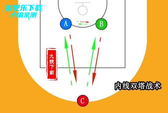 该战术需要队伍中存在两名内线球员,组合需要C位中锋+C位中锋/PF大前锋+SG得分后卫/SF小前锋。内线双塔顾名思义在内线具有极强统治力,说它为战术不如叫它一种队伍组合。这种战术思路极其简单粗暴,通过内线球员的篮板能力,获得二次进攻球权;内线球员的防守干扰能力,阻止对面进攻得分,甚至在盖帽成功后同样能拿到二次球员。外线完全放弃组织进攻能力,用SG/SF的得分能力去取而代之。