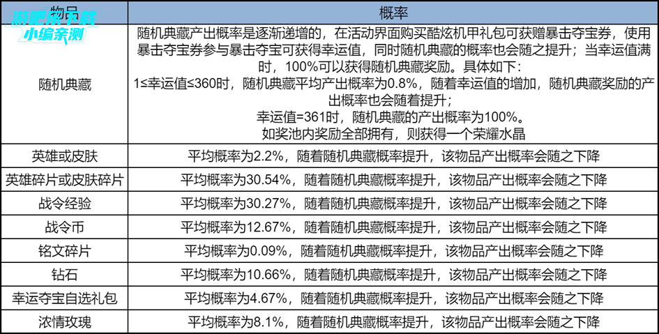4、暴击夺宝奖励:每次暴击夺宝,有机会获得: 随机典藏奖励(具体物品详见下方随机典藏奖励说明)、皮肤、皮肤碎片、英雄碎片等奖励。