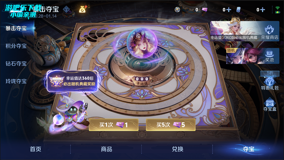 玩家参与暴击夺宝,每次都有机会额外获得更多的幸运值,暴击夺宝幸运值达360之后,下一抽必得随机典藏奖励。
