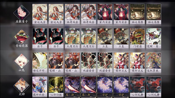 阵容由四个式神组成,玩家可以任意选择四个式神进行搭配,每个式神可分别选择8张手牌,组成一套完整的阵容卡组。